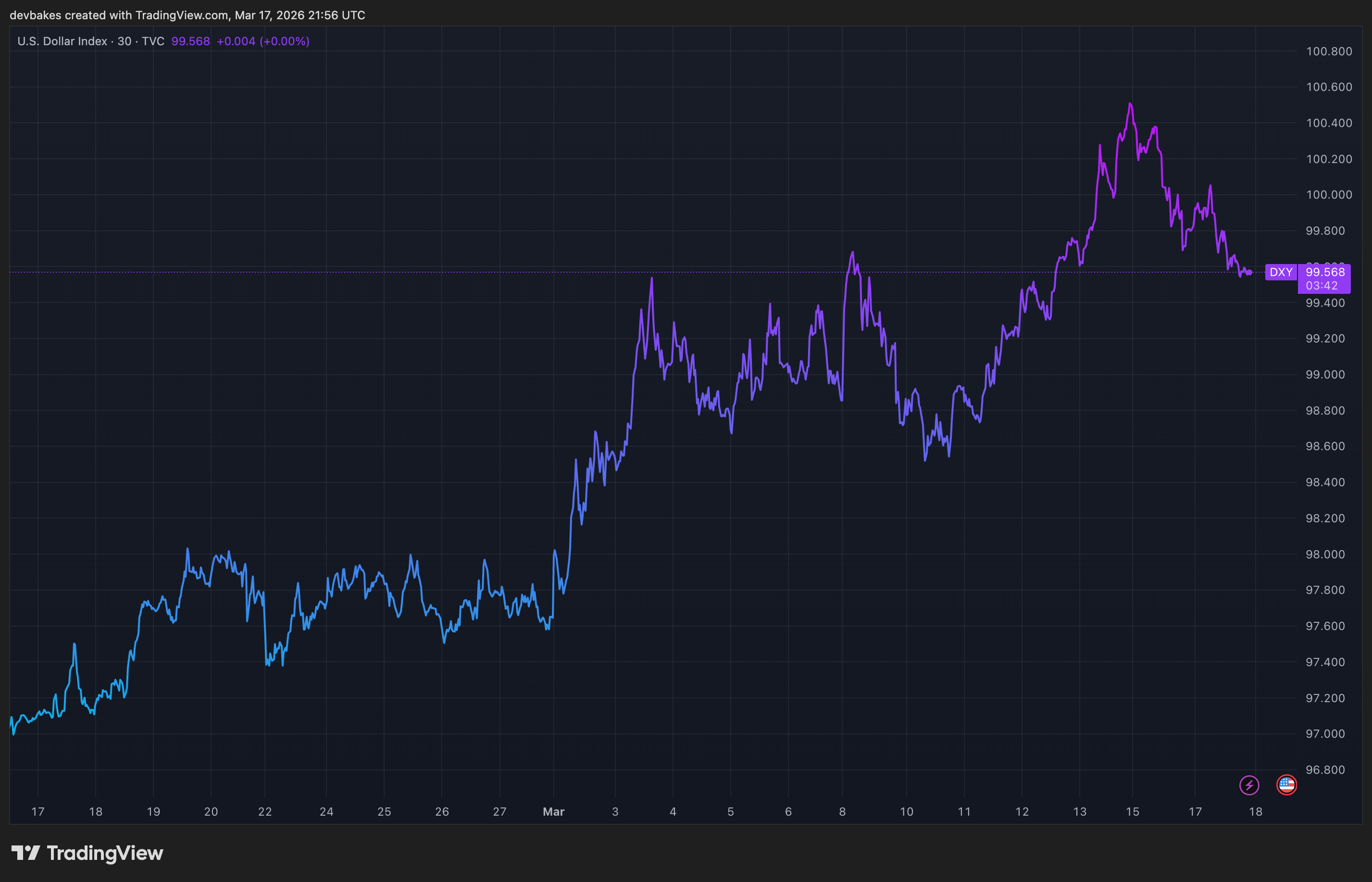 USD strengthening: USD ~+2% since the initial strikes in Iran, testing the 100 level.