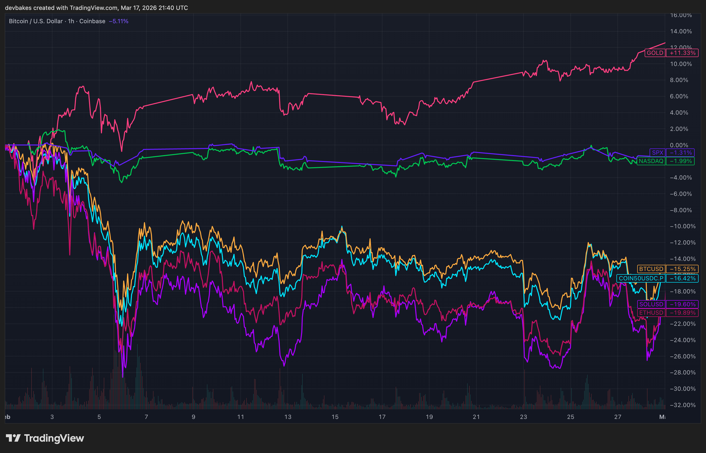 BTC is trading more like digital gold than the NASDAQ: For now, BTC is delivering on its vision - a neutral, non-sovereign store of value. In the context of global economic and kinetic war, its utility skyrockets. Gold has performed very well in anticipation of the conflict, but since strikes began, crypto has outperformed.