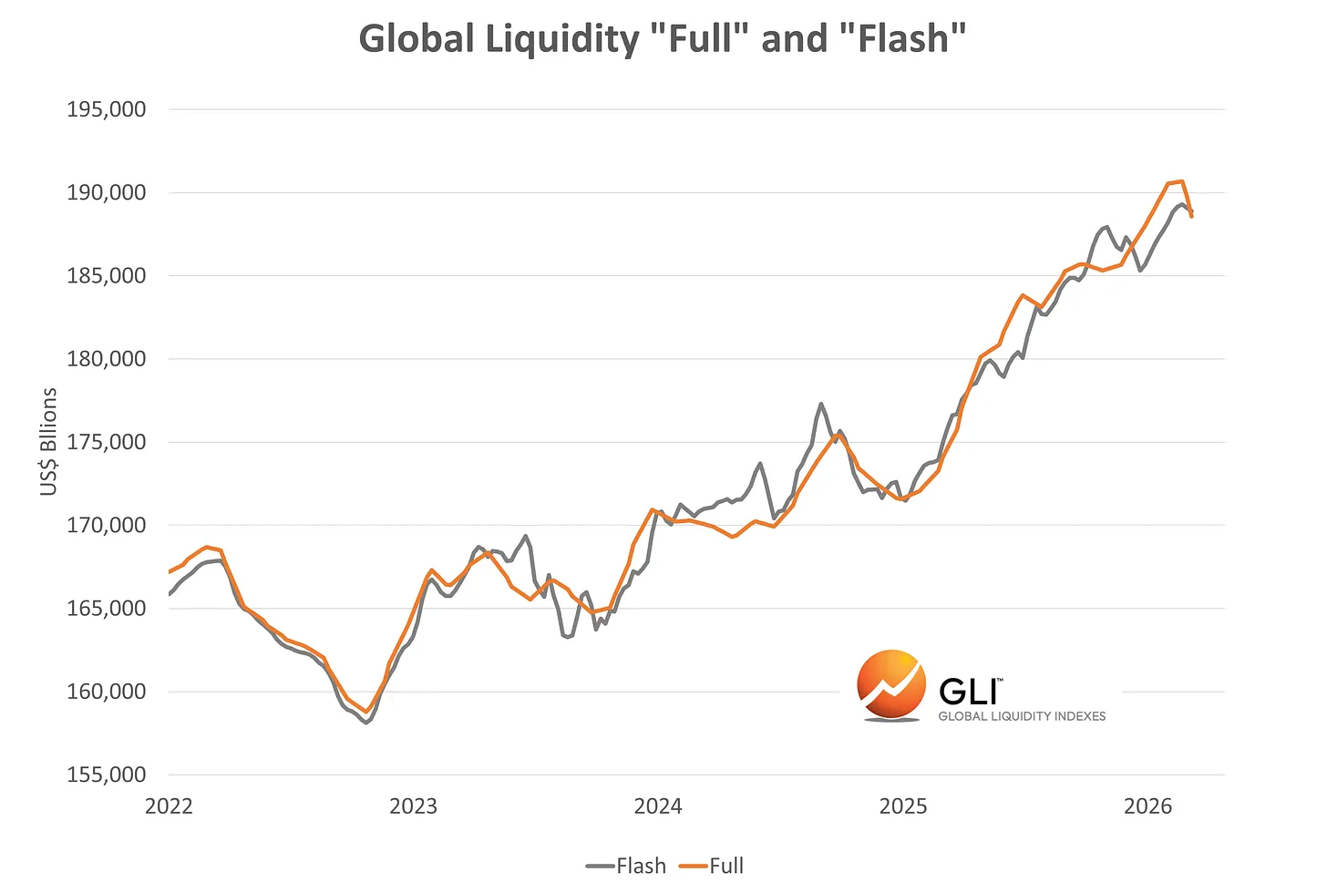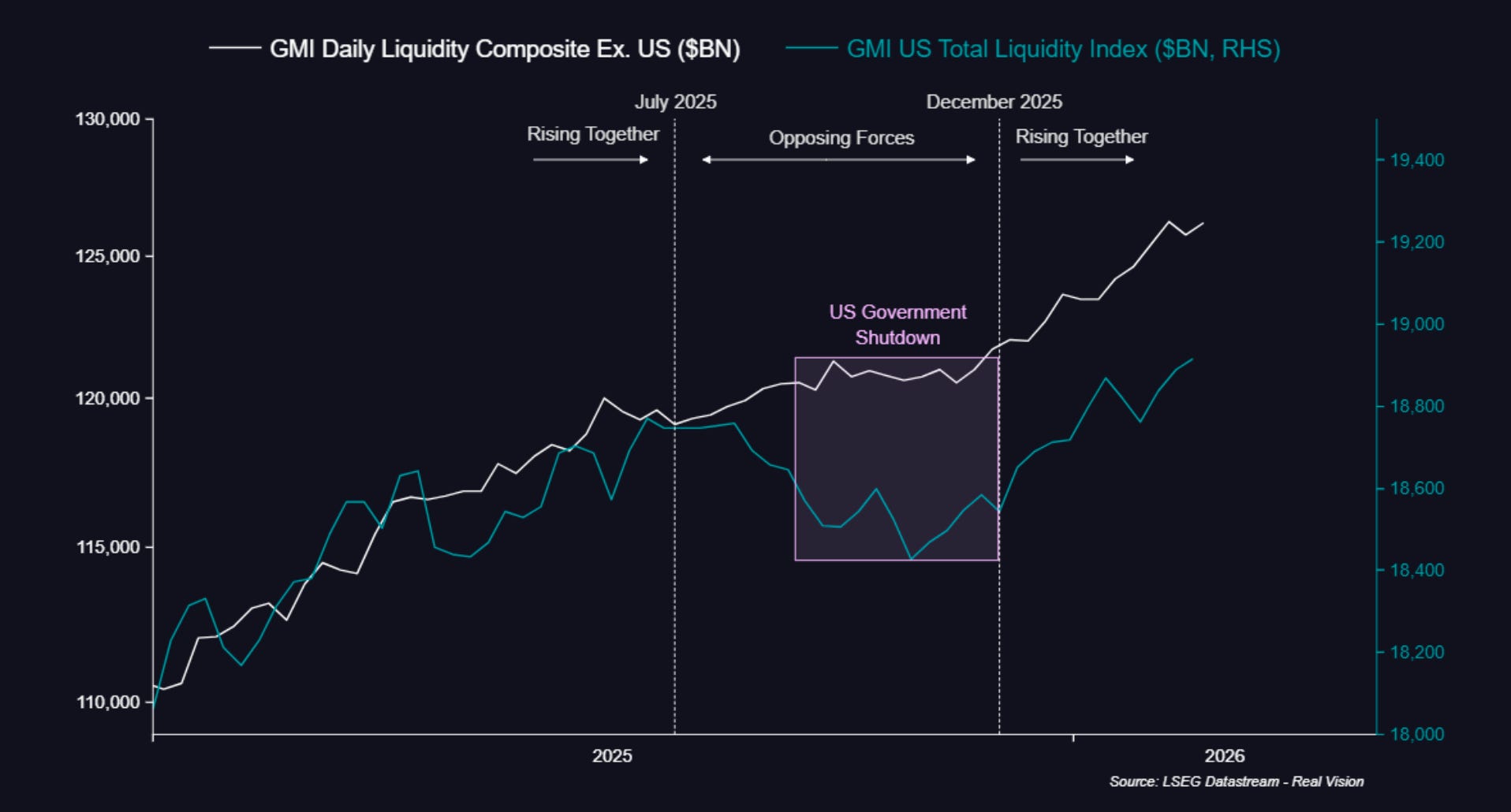 Global liquidity dipping slightly: Still right at ATHs, but dipping slightly, largely due to the stronger USD and rising bond volatility.