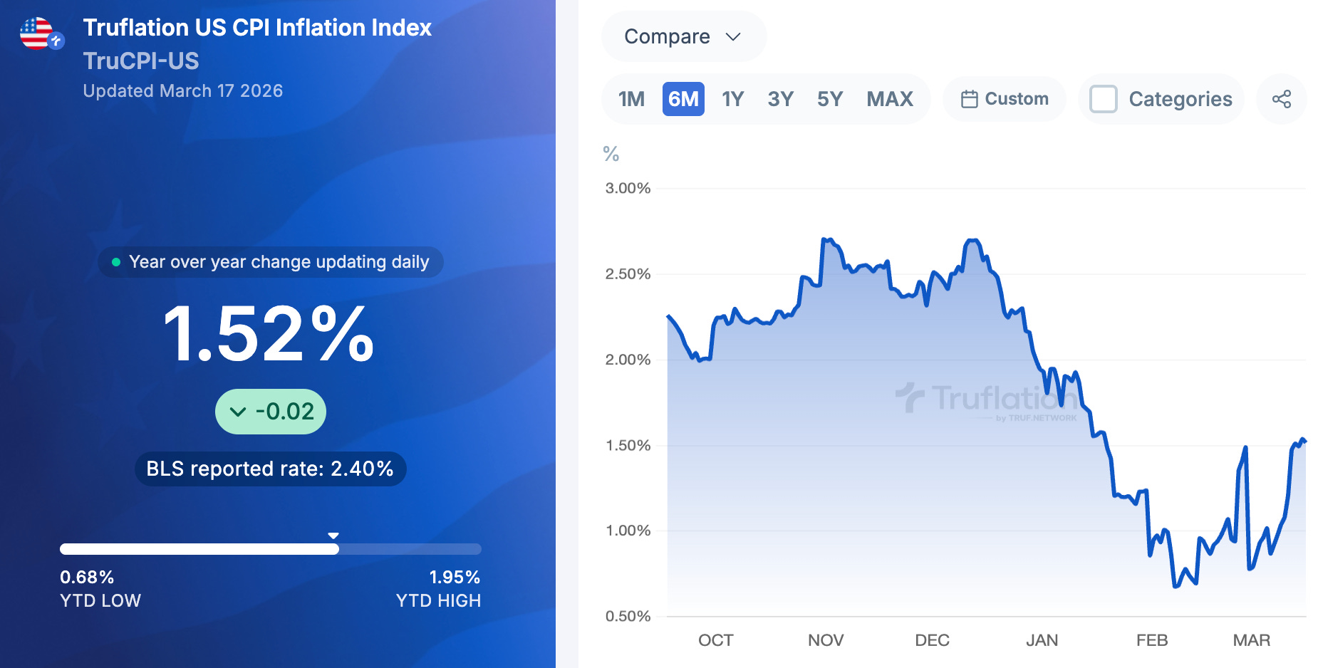 Inflation climbing: Truflation readings moved up from well below 1% to ~1.5%.